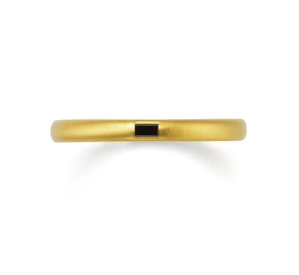 下 細身のマットゴールドのアームにブラックダイヤの渋い輝きが光る結婚指輪。