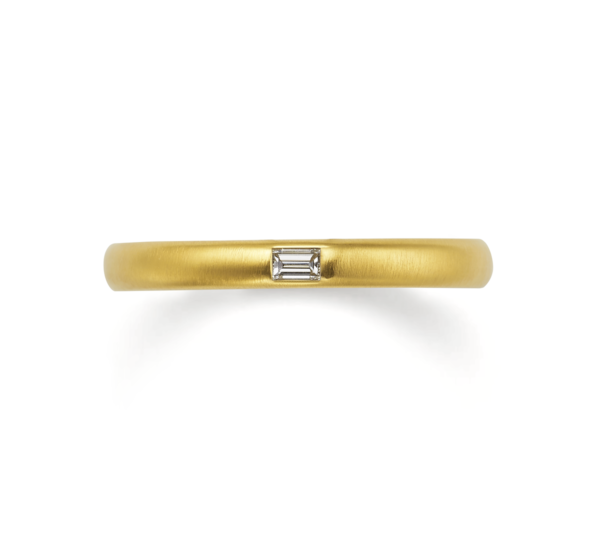 上 細身のマットゴールドのアームにバゲットカットダイヤの静かな輝きが魅力の結婚指輪