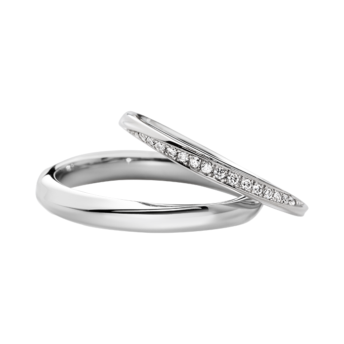 シンプルだがひねりのあるデザインはリングを見る角度により様々な表情が楽しめる。