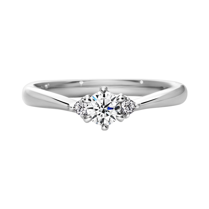 センターダイヤから広がる緩やかなV字ラインは、幸せの天使の羽を表し、センターダイヤに寄り添う2石のメレダイヤは、花嫁の女性らしさを表現しています。